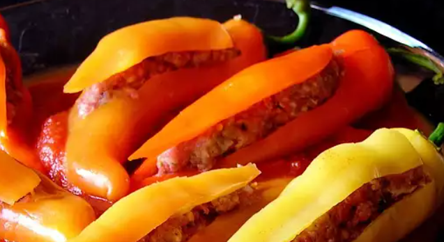 Fill each pepper with sausage mixture using a piping bag or sausage stuffer. Place in a 3-quart casserole dish; pour remaining tomato sauce mixture over peppers.