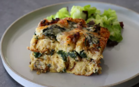 Ingredients 1 large loaf Italian or French bread1 Tbs olive oil plus more to grease baking dish12 oz Italian sausage, casings removed1 yellow onion, diced1/2 tsp freshly ground black pepper1/4 tsp dried oregano1/4 tsp dried thyme1/8 tsp dried rosemary1 pinch cayenne pepper1 lb baby spinach12 large eggs2 tsp kosher salt4 cups milk8 oz fontina or fontal cheese, shredded Directions Step 1: Cut bread into ...