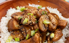 Ingredients Sauce:1/4 cup white sugar1/4 cup balsamic vinegar1/4 cup low-sodium soy sauce1/4 tsp ground white pepper1/4 tsp ground ginger1/8 tsp ground coriander Chicken:2 Tbs avocado oil1/2 lb skinless, boneless chicken breastsalt to taste1/2 lb sliced crimini mushrooms2 cups cooked white ricechopped green oniontoasted sesame seeds Directions Step 1: For sauce, place a heavy-bottomed pot over medium heat. Add sugar, ...