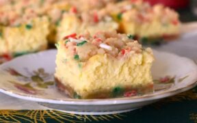 Ingredients Crust and Crumb Topping:3/4 cup unsalted butter, softened1/2 cup firmly packed light brown sugar1/2 cup white sugar3/4 tsp salt1/4 tsp ground nutmeg2 tsp vanilla extract1/2 tsp almond extract2 cups all-purpose flour1/3 cup holiday sprinkles Filling: 2 (8-oz) pkgs full fat cream cheese, softened1/2 cup white sugar1 Tbs all-purpose flour1 tsp vanilla extract1/4 tsp salt1 pinch ground nutmeg2/3 cup heavy cream, at room temperature1 Tbs lemon juice2 large eggs, at room temperature Directions ...