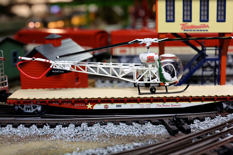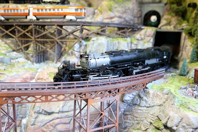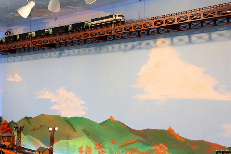 And now you have a much larger, permanent layout as well?When I retired in around 2011, I started going to train shows. I’ve always wanted to have a permanent layout—a real nice layout—so in 2014, I contracted with a Dallas firm, TW TrainWorx, that I met at a train show. My wife and I used to…well, I used to go to many of them. Junie made one! She’s not really into trains. She went to a show with me in Denver. The guy with this firm from Dallas, Roger Farkash, offered a model mountain building class I went to, so I began talking to him. I told him I wanted to have the layout, but I didn’t have the time or expertise to create it on my own, because it’s going to be about 20×30, but neither did I want to do it without participating. So with the training from the class, I carved the mountains and did a lot of other things, and they did the lion’s share of the work. I went up once a week, sometimes for a couple of days, and worked on mountains and other aspects. I then asked my niece, Jennifer Hughes from Onalaska, to custom paint the landscape backgrounds on the walls to give the layout a more realistic look.