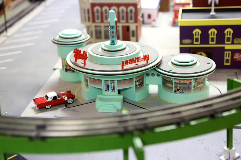 And you started with a Christmas layout?I came to Huntsville in 1995 to do some prison work, and I met my current wife. Junie and I moved down here permanently in 1999. We moved into our current house in 2004. One reason we bought it was the large detached storage room, which is ideal for storing and setting up the trains. It was then that I got the idea to do a Christmas train layout. It started on a 4×8 piece of plywood, then it was 6×8, then it was 6×12, then it was 6×16. It just kept growing. We always have a Christmas party…sometimes two…and the kids love to come (and the adults, too!) But I’m the one who really loves it. That’s how I got started with the Christmas layout. Lionel has just come out with a new LionChief controller that’s just about kid-proof. You can’t do anything wrong. You can’t run the train too fast. So it’s great. The kids love running the trains when they come out at Christmas. I also have a Halloween layout with special trains I do for Halloween.
