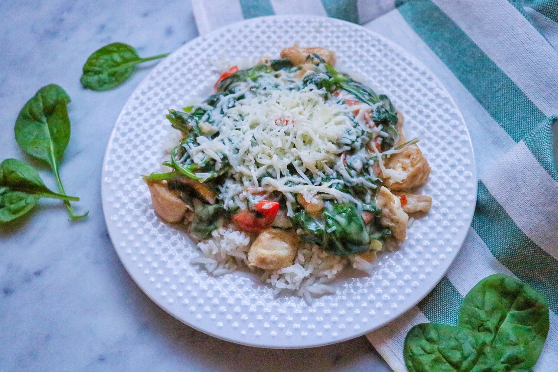 Step 3 Add shallot and garlic to the skillet and cook for about 2 minutes. Add tomatoes and cook 2 more minutes. Add condensed soup, chicken broth, and sour cream; stir to combine. Add spinach and cook for 5 minutes.