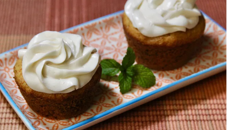 Meanwhile, prepare frosting by beating cream cheese, butter, vanilla, and confectioners’ sugar together until fluffy. Frost the cooled muffins and chill until ready to serve.