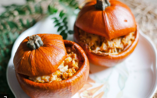 Bake in the preheated oven for about 1 hour. When serving, scrape the insides of the pumpkin to get some of the soft flesh in each bowl.