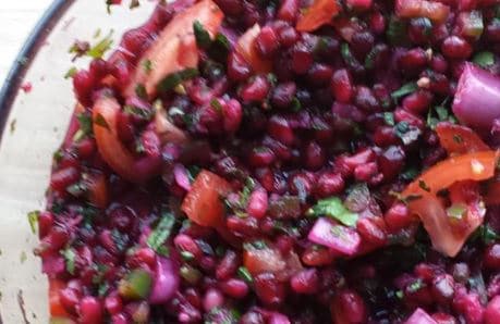 Step 1 In a medium bowl, toss together mint, cilantro, Italian flat leaf parsley, red onion, pomegranate, lime juice, lime zest, jalapeno pepper, serrano pepper, tomato, and olive oil. Season with salt and white pepper.