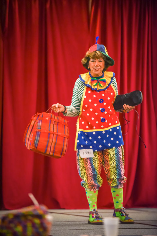 The intermission is followed by more skits and a conversation with Judy “Peep” Cornett (wearing a bright bowler hat), President of the Texas Clown Association, member of the local club Clown Alley, and member of Clown of America International. A clown for 19 years, her favorite things to do are volunteer activities like hospital clowning. She knew she wanted to be a clown when she realize her insatiable desire and satisfaction of making people smile. Clowning has taken Judy as far as Italy; she plans to finish her term as president and remain involved and committed to the cause. “A good clown performs from the heart,” she adds.