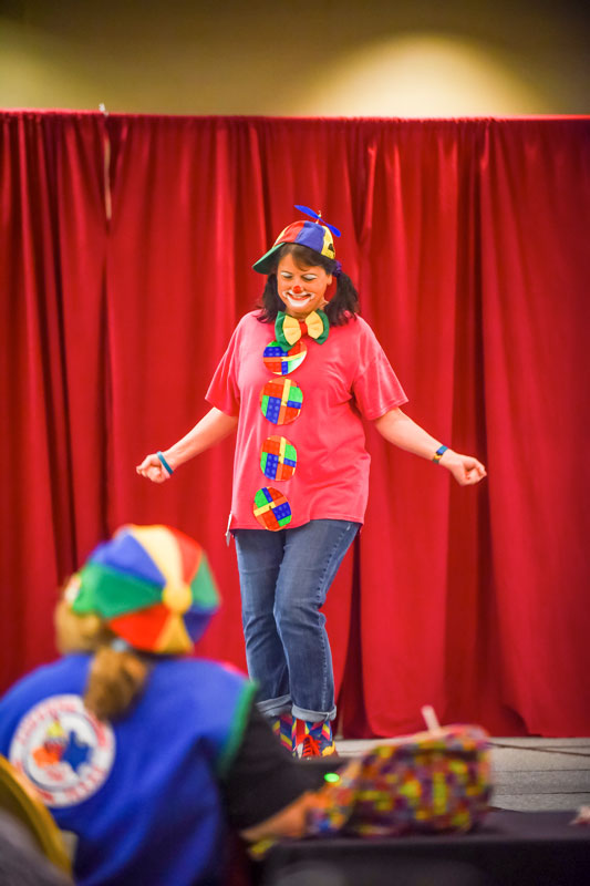 Although an old-fashioned form of entertainment, the art of clowning is still alive and well. Small clowning clubs thrive on the energy and dedication of many longtime members. Postcards received an invite to a recent convention of the Texas Clown Association, which was held in Montgomery. Upon arriving, we were greeted warmly and discovered the hobby is composed of some of the kindest, happiest people you would ever have the pleasure of meeting. Upon entering the convention, I had the pleasure in the lobby of meeting a clown named Heart (Theresa Stokes by day) who was not in costume, but in jeans and a T-shirt, with a pass on a lanyard around her neck. Some who came for entertainment are in character, along with those performing in tonight’s skits—red noses pressed onto dramatically painted faces, accompanied by a bright and whacky ensemble of different colors and patterns. When asked how her love for clowning began, Heart said her grandfather would bring her Blue Magic magazine when she was a young girl, and ever since, she fell in love with clowning and aspired to be one. Heart inadvertently made a wonderful first impression for the involved lot, and we did not meet an unfriendly or dull soul for the remainder of the night.