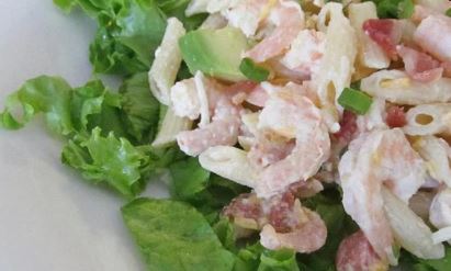 In a large bowl, gently toss together the pasta, bacon, shrimp, avocados, Cheddar cheese, mayonnaise, lemon juice, tomatoes, and red pepper. Serve over lettuce.