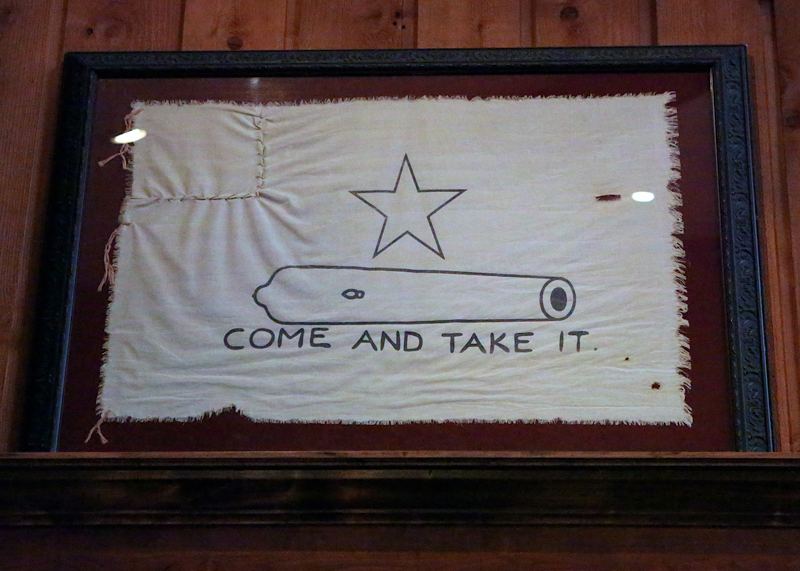 Nina has displayed several replicas of Texas artifacts in the restaurant, including the famous “Come and Take It” cannon, which sparked the battle of Gonzales in 1835. Also on display is an exact replica of the “Come and Take It” flag. The original, Nina says, was made from the wedding dress of Mrs. Green Dewitt.